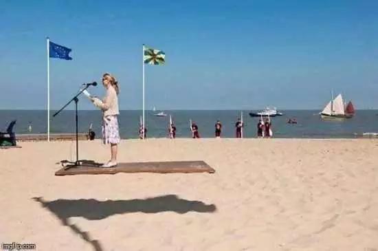 女孩现在木台上,旗杆的影子让我们产生了错觉。
