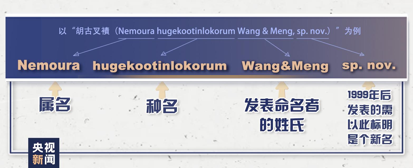 种名:种名的自主性较强,可以范围很广泛,几乎可以随意确定。在国外,不少学者喜欢用亲朋好友的名字给新物种命名。“胡古叉襀”遵循《国际动物命名规约》(第4版)第31.1.2条款,以胡歌姓名的拼音“Hu Ge”、古天乐姓名的拼音“Koo Tin-lok”加上拉丁化后缀“-orum”来命名。