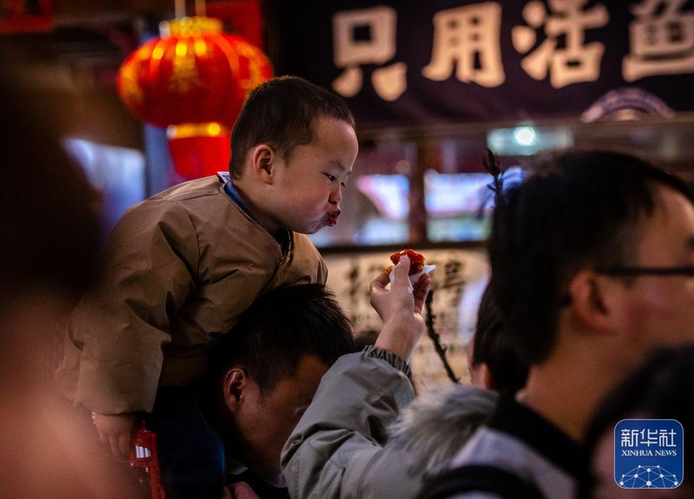 1月23日,在云南省昆明市南屏街,一个小孩子在品尝特色小吃。新华社记者 胡超 摄